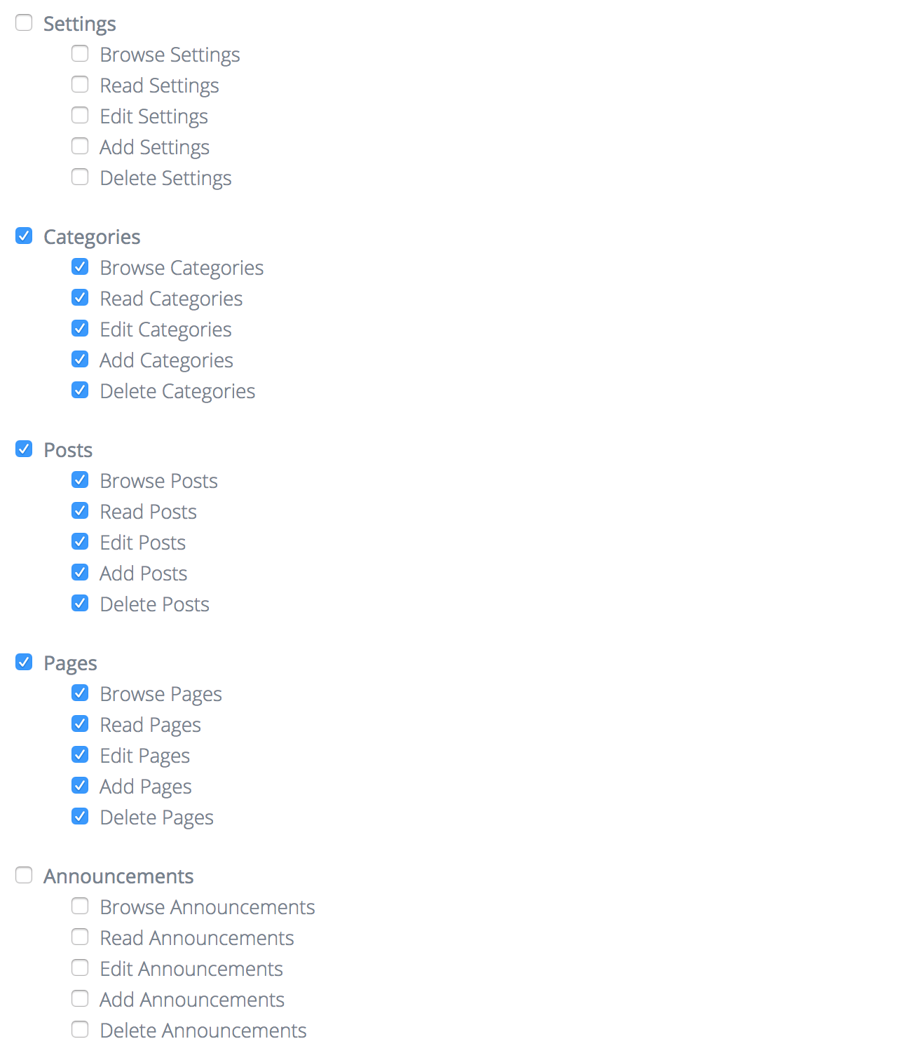 Notice on this page you can specify permissions for this role. We will talk more about this in the next section. For now, you can choose to check a few of them, or leave them all unchecked. Below is a screenshot of what I have checked in this example: